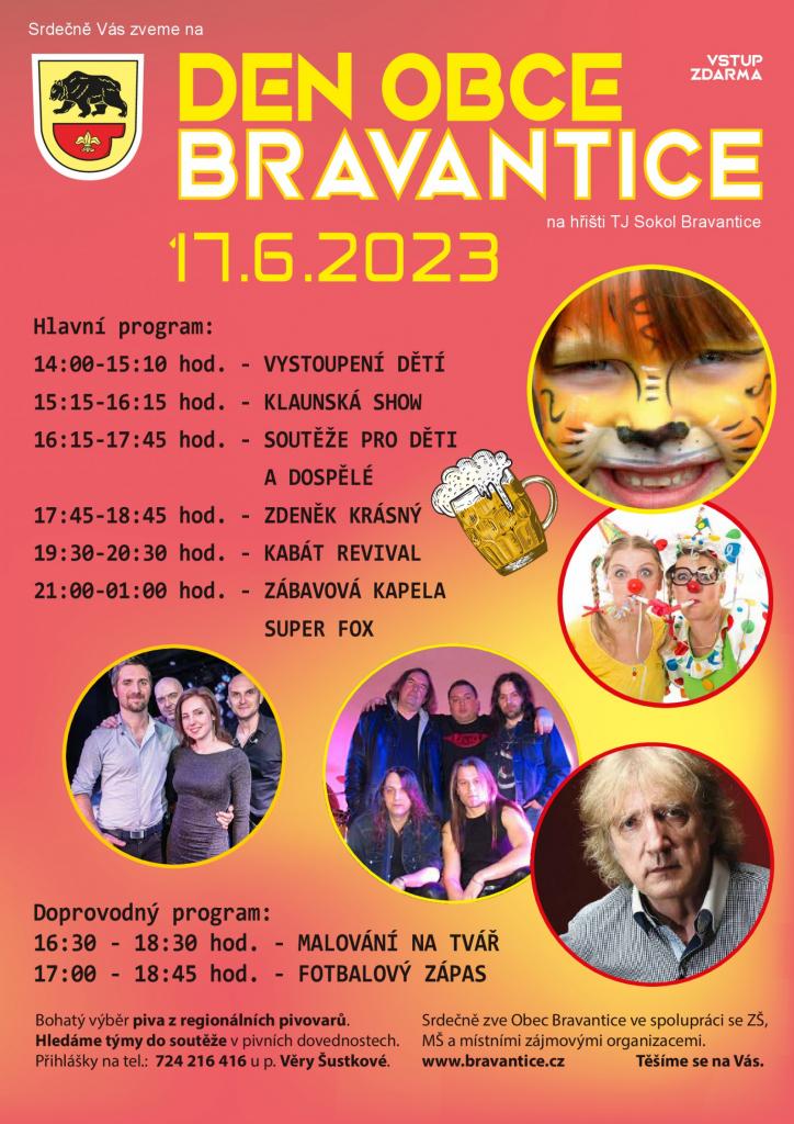 Obec Bravantice ve spolupráci se ZŠ, MŠ a místními zájmovými organizacemi srdečně zve na tradiční Den obce Bravantice. KDY: 17. 6. 2023 od 14 hod. KDE: na hřišti TJ Sokol Bravantice Program přiložený v příloze.