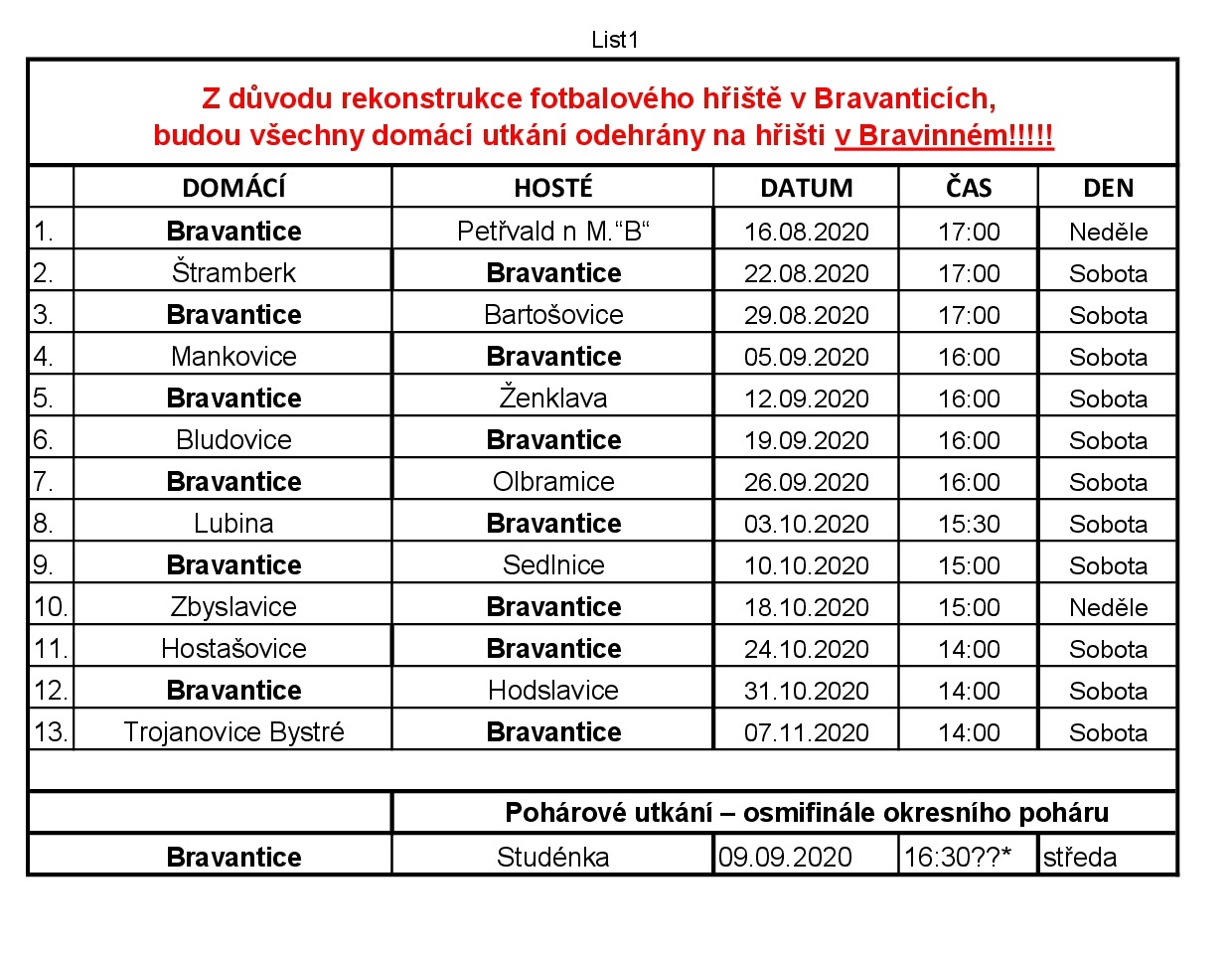 Rozpis podzimních zápasů mužů TJ Sokol Bravantice.