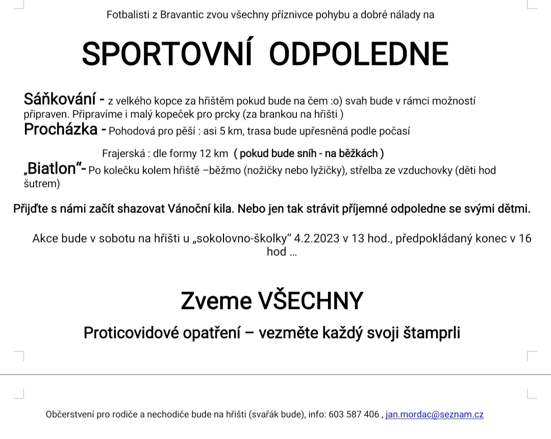 TJ Sokol Bravantice zve všechny příznivce pohybu a dobré nálady 4. 2. 2023 v 13 hod. na Sportovní odpoledne.